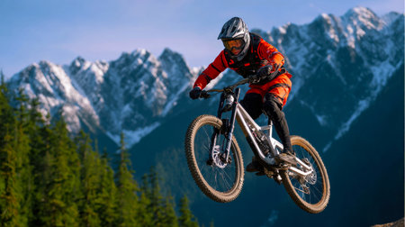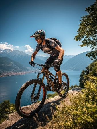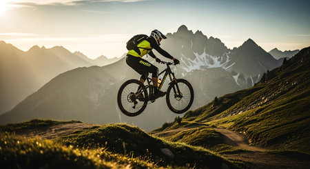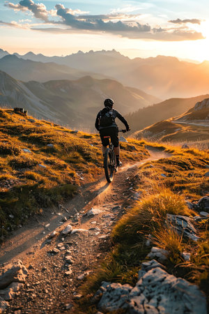 Mountain biker is riding down a trail, enjoying the thrill of the sport amidst a breathtaking mountain landscape