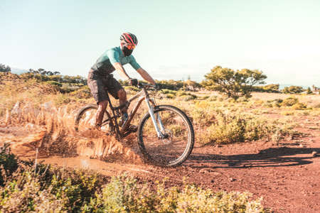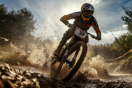 A competitive mountain biker navigates through muddy trails, creating splashes under a dramatic sunset sky.