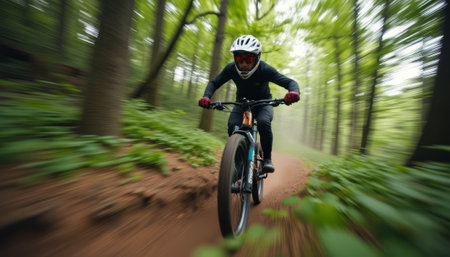 A dynamic shot of a cyclist speeding through a lush forest trail, the motion blur emphasizing the exhilaration and freedom of outdoor sports.