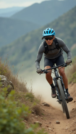 A determined male mountain biker navigates a challenging dirt trail, showcasing his athleticism and focus. The backdrop of rolling hills and misty mountains adds a sense of adventure and freedom to the scene.