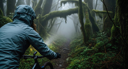 Female mountain biker in blue rain jacket riding on trail in mysterious foggy mossy forest, exploring nature wilderness path.
