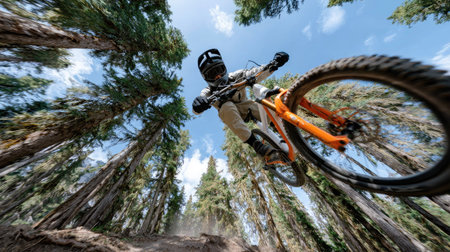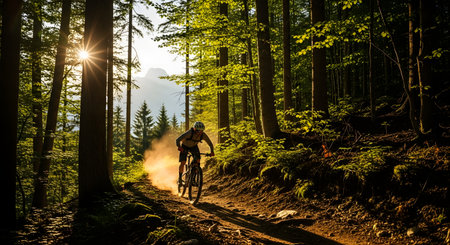A bicyclist skillfully navigates through a stunning forest landscape, showcasing the thrill of outdoor biking. The bright sunlight filters through the trees, enhancing the adventurous spirit of this exciting moment in nature.