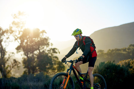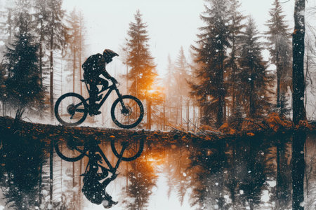 A cyclist races at sunset in difficult cross-country conditions . Generative AI