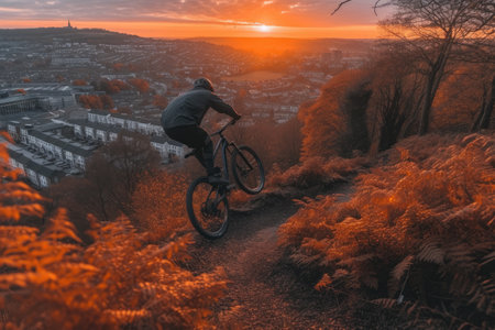 person riding bike hill sample left align content vertical profile action sports expectation adventure outdoors night climbing underexposed overlooking, generative ai