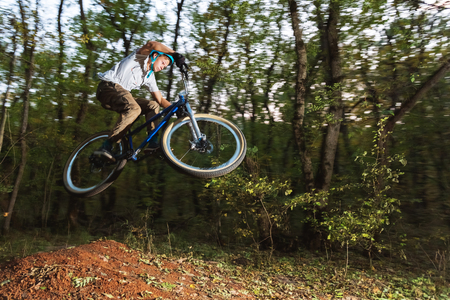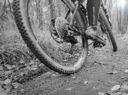 Mountain bike rider in action on the forest trail. Extreme sport.
