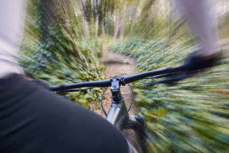 mountain bike and sports person in forest, park and path for adventure, speed and motion blur. Closeup perspective of bicycle handle, fast athlete and cycling action in nature for off road race
