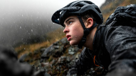 A young man is wearing a black helmet and jacket and is looking down at the ground. Concept of adventure and determination as the young man navigates the rocky terrain