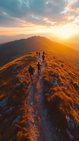 A group of cyclists rides along a winding trail on a hillside during sunset. The sky is painted with warm hues, enhancing the outdoor experience in a natural landscape.