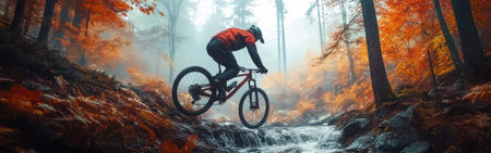 A mountain biker skillfully maneuvers over a creek in a colorful forest filled with autumn leaves. The misty atmosphere enhances the dynamic feel of the moment.