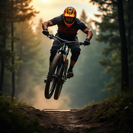 A skilled mountain biker, clad in protective gear, speeds along a winding dirt trail surrounded by vibrant greenery. The image captures the thrill of adventure and the beauty of nature, showcasing the riders determination and the exhilarating rush of outdoor sports.