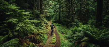 Panoramic view of a cyclist on a path through a lush forest, showcasing ecofriendly exploration and wanderlust , cinematic