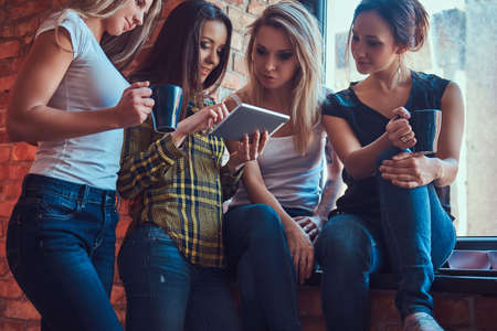 Group of female friends in casual clothes discussing while looking something on a digital tablet in a room with loft interior.