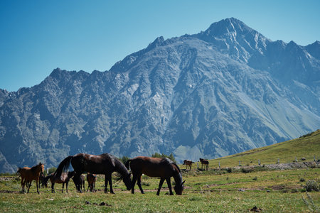 Stepantsminda village, Kazbegi. A herd of Georgian horses graze on the green grass against the backdrop of the rocky mountains in summer. Free horses on a walk