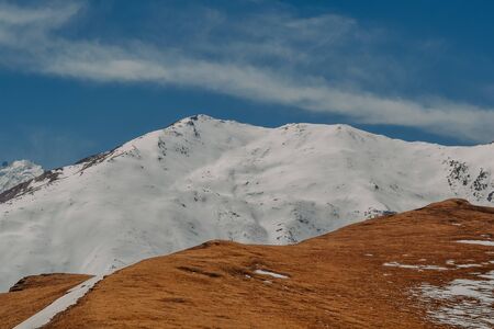 Clouds fly low over the rocks. Mountain peaks covered with snow. The varied mountain landscape in Georgia.