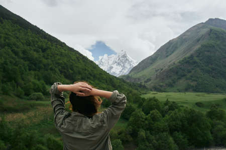 Woman in red shirt standing on a mountain viewpoint, gazing at the snowy peaks and lush green valleys of the Caucasus Mountains in Georgia under a bright blue sky, travel concept