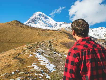 Traveler man looks at the top of the mountain, standing back. Travel lifestyle, holiday vacation concept