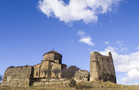 Old churh is situated against the blue sky background. Jvari Monastery stands on the rocky mountain top at the confluence of the Mtkvari and Aragvi rivers
