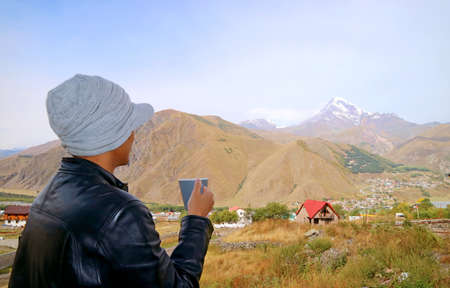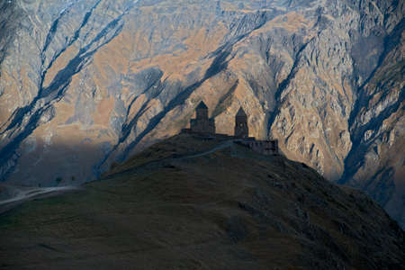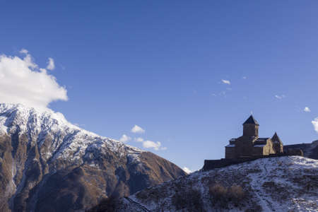 Beautiful view on Holy Trinity Church or Gergeti Trinity Church over Kazbek mountain. View from Stepantsminda town