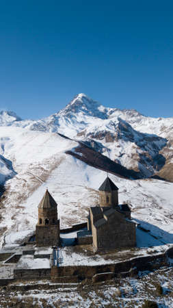 Aerial photo of the lonely historic Gergeti Trinity Church in Kazbegi, Georgia. It is winter.There are snowy mountains around the church and clear blue sky. Georgian ortodox architecture, culture.