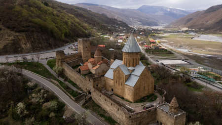Famous aerial Jvari Monastery view in Mtskheta town near Tbilisi, Georgia