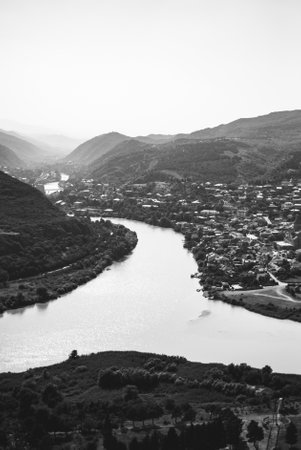 Mtskheta, Georgia - August 6, 2018: Beautiful view from Jvari Monastery to town of Mtskheta and confluence of Aragvi and Kura rivers.
