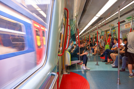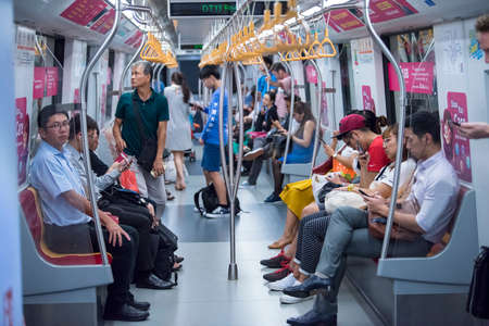 Singapore City, Singapore - September 08, 2019: Passengers in a Mass Rapid Transit (MRT) subway train in Singapore.