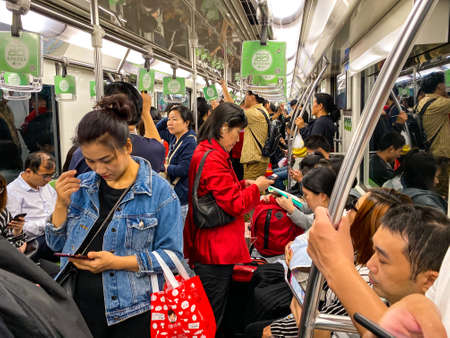 A packed subway car in Shanghai China with commuters seated and standing