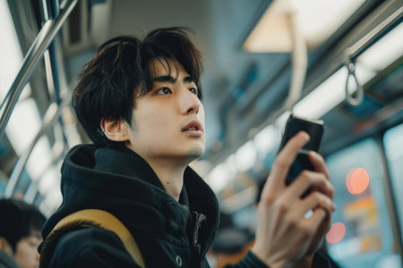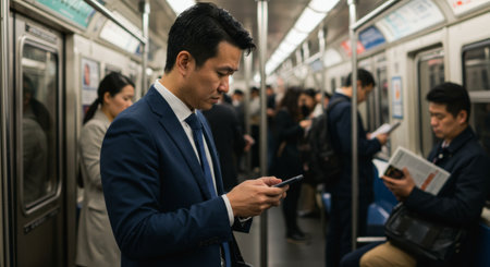 A focused Asian businessman uses his smartphone on a crowded subway train, showcasing modern urban commuting and mobile technology in business travel.