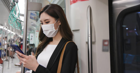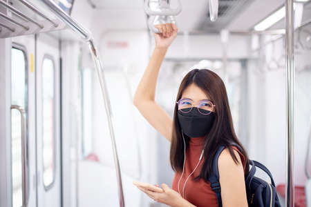 Young Asian woman passenger wearing surgical mask and listening music via mobile phone in subway train