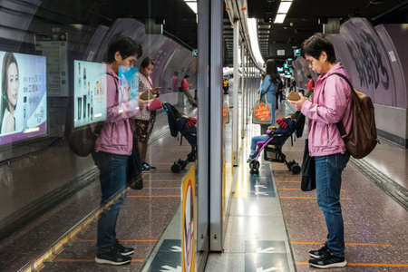 Hong Kong - November, 2019: Woman waiting for train looking on mobile phone at MTR station / subway train station in Hong Kong