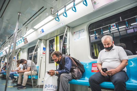 Unidentified Turkish people wear masks to protect against covid-19 for social distancing policy while transporting at Marmaray train in Istanbul,Turkey :16 June 2020