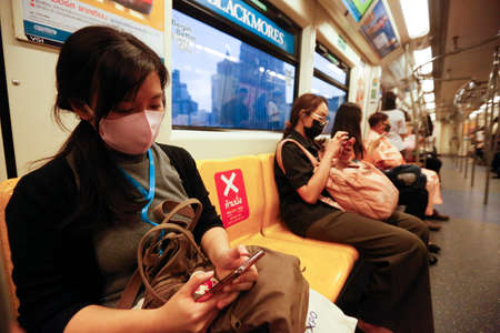 KUALA LUMPUR, MALAYSIA - MAY 5, 2020: People wearing a face mask and using mobile phone as they ride in LRT train. Malaysia Coronavirus disease 2019 (COVID-19) outbreak.