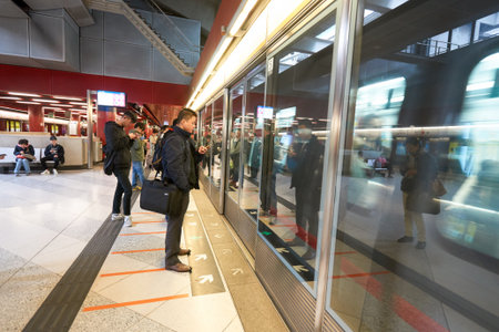 WARSAW, POLAND - MARCH 5, 2018. Train departing from Rondo ONZ metro train station