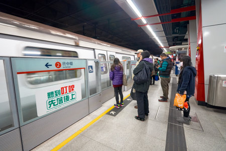 HONG KONG - CIRCA DECEMBER, 2019: commuters inside a MTR train in Hong Hong. The Mass Transit Railway (MTR) is a major public transport network serving Hong Kong.