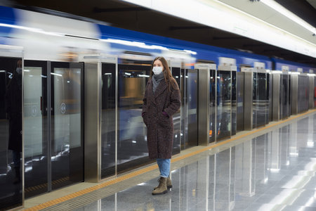 A full-length photo of a woman in a medical face mask to avoid the spread of virus who is waiting for an arriving modern train on the subway. Girl in a surgical mask is keeping social distance.