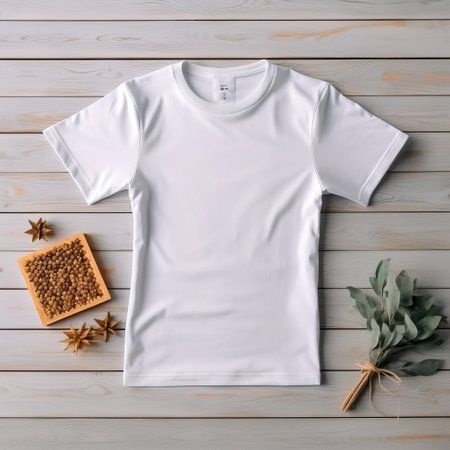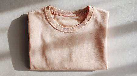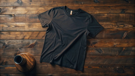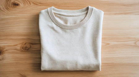 Simple round neck T-shirt mockup placed on light wood surface, soft daylight, clean and calm fashion scene