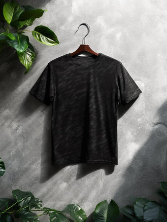 Blank black t-shirt hanging on a simple wooden hanger, isolated against a light grey background, showcasing the fabric texture and fit. --chaos