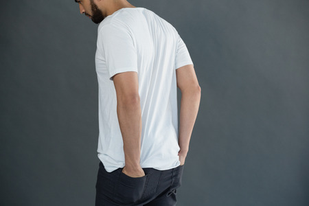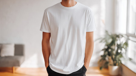 Minimalist fashion concept with male model in white t-shirt mockup, centered in bright, empty indoor space
