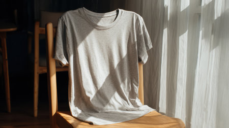 Basic grey t-shirt mockup draped casually over a chair, natural sunlight entering through window for relaxed mood