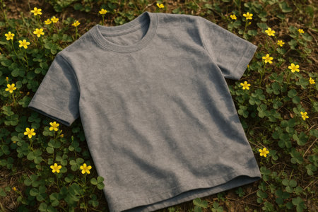 Plain gray cotton t shirt lying on green grass surrounded by blooming yellow flowers in natural outdoor environment.