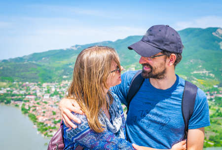 Close up of young couple hugging each other and smiles face to face with panoramic scenic view to green nature nd Mtkheta town in Georgia. Travel buddies relationship. concept of travel couples joy