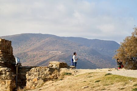 Mtskheta, Georgia - October 25, 2019: Tourist on the observation deck in the mountains in a summer or autumn day. Travelers in Georgia near the Jvari monastery