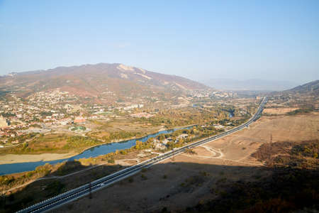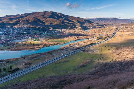 Top view of Georgian Military Road, Aragvi River and town of Mtskheta