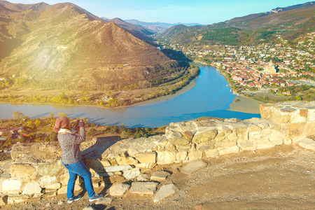 Asian backpacker woman in winter suit with camera take photo of view of Jvari Monastery Georgia with 2 rivers and Svetitskhoveli Cathedral with Mtskheta town in background.