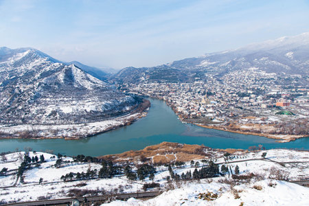 View of the city of Mtskheta from the Jvari Monastery. Confluence of the Aragvi and Kura rivers. Mtskheta, Georgia, December 2023
