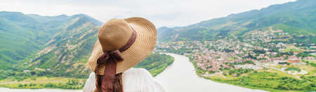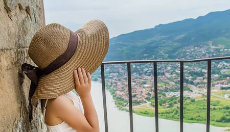 Woman traveler on the background of the attractions of Georgia. Near the monastery Jvari. Selective focus. nature.