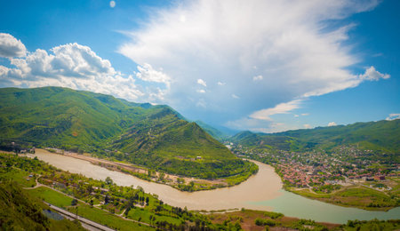 Aragvi and Kura rivers confluence near city of Mtskheta in Georgia republic