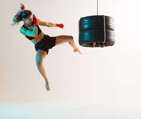 Cool female fighter jumps training with tyres and levitating in studio in neon. Kickboxing school poster