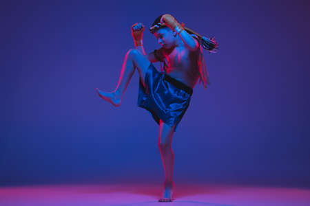 Little caucasian girl, kick boxer on gradient background in neon light, active and expressive. Concept of motion, action, motivation. Training winner, emotional. Sales, ad, flyer with copyspace.