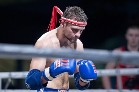 Nakhon Pathom, Thailand - November 21, 2015: Thai Boxer in World Muay Thai Fight 2015 King Cup. Semifinals at Royal Police Cadet Academy.